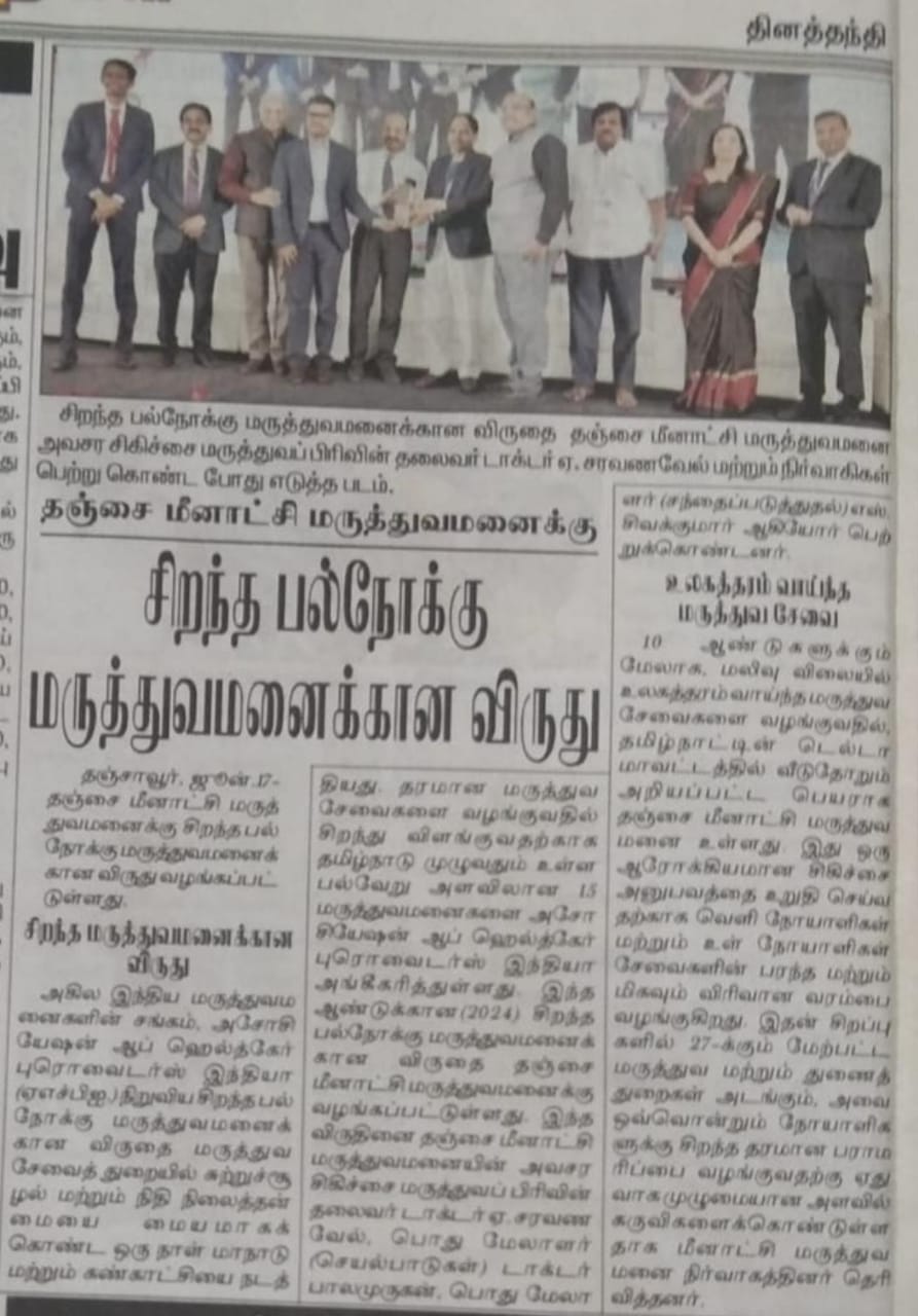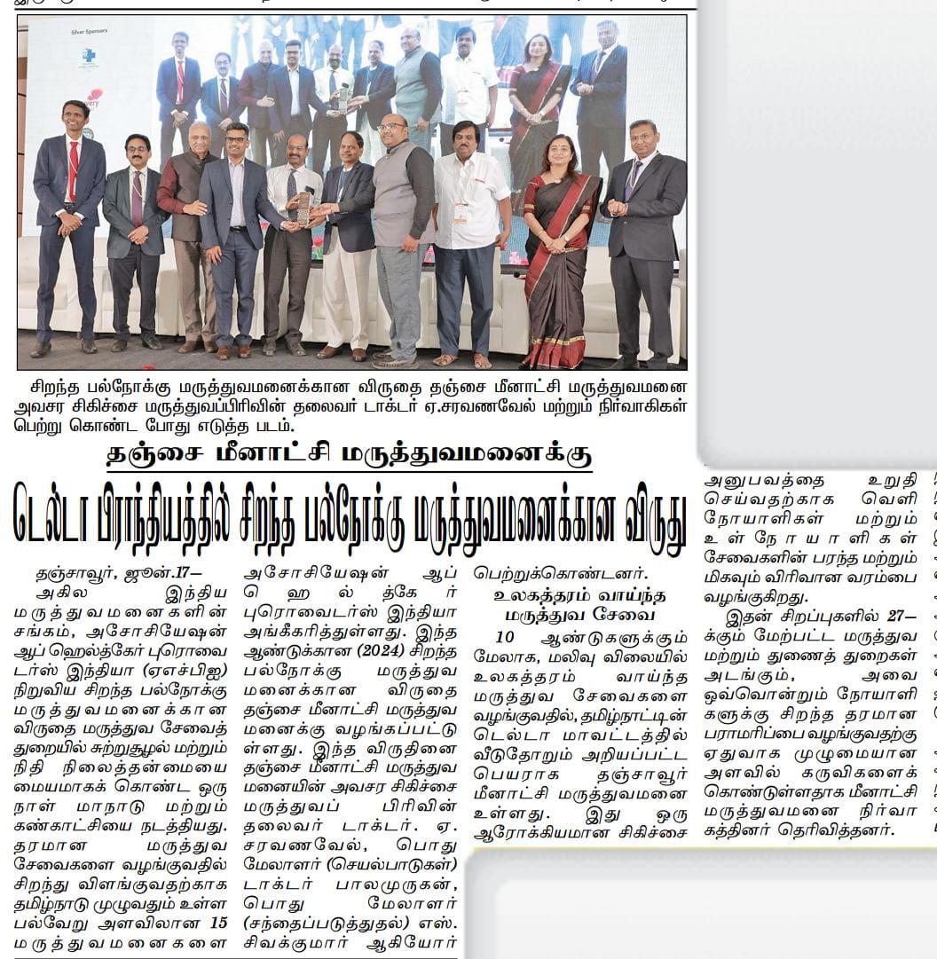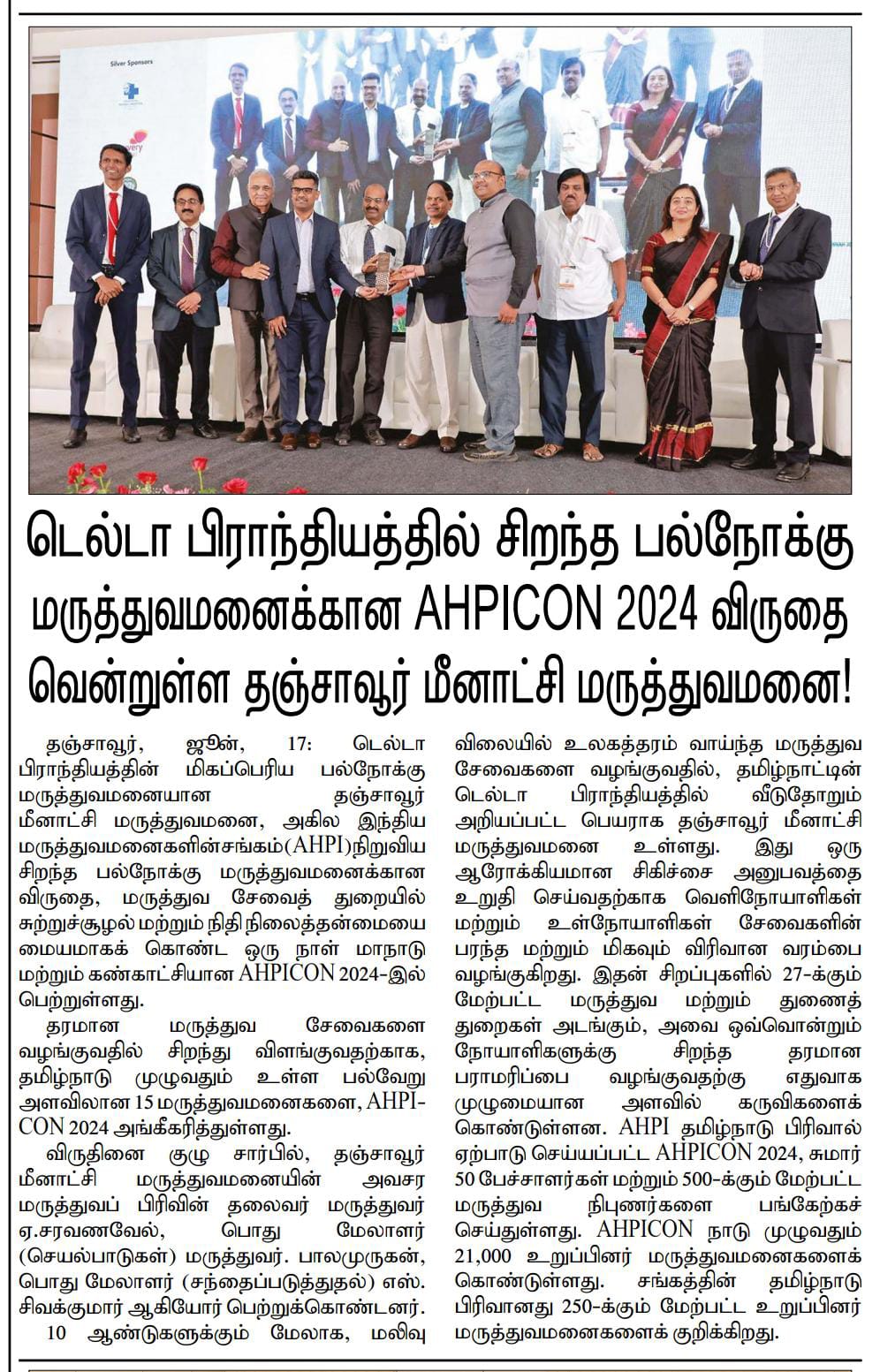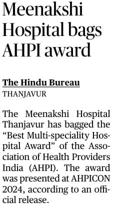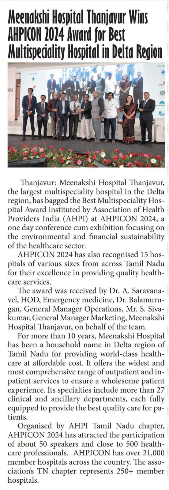 Meenakshi Hospital, Thanjavur, the largest multispeciality hospital in the Delta region, bagged the Best multispeciality Hospital Award instituted by Association of Health Providers India (AHPI) here today at AHPICON 2024, a one day conference cum exhibition focusing on the environmental and financial sustainability of the healthcare sector.