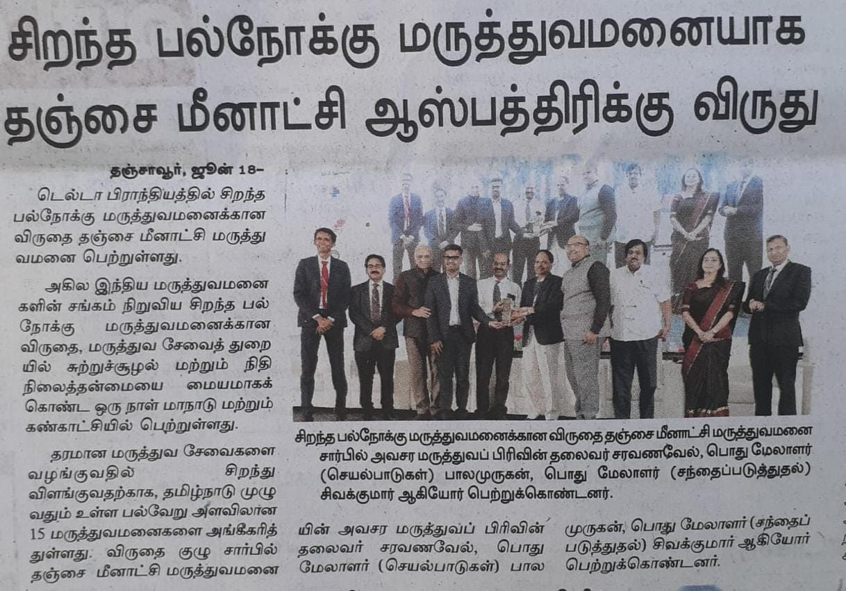 The award was received by Dr. A. Saravanavel, HOD, Emergency medicine, Dr. Balamurugan, General Manager Operations, Mr. S. Sivakumar, General Manager Marketing Tanjore Meenakshi Hospital, on behalf of the team.
