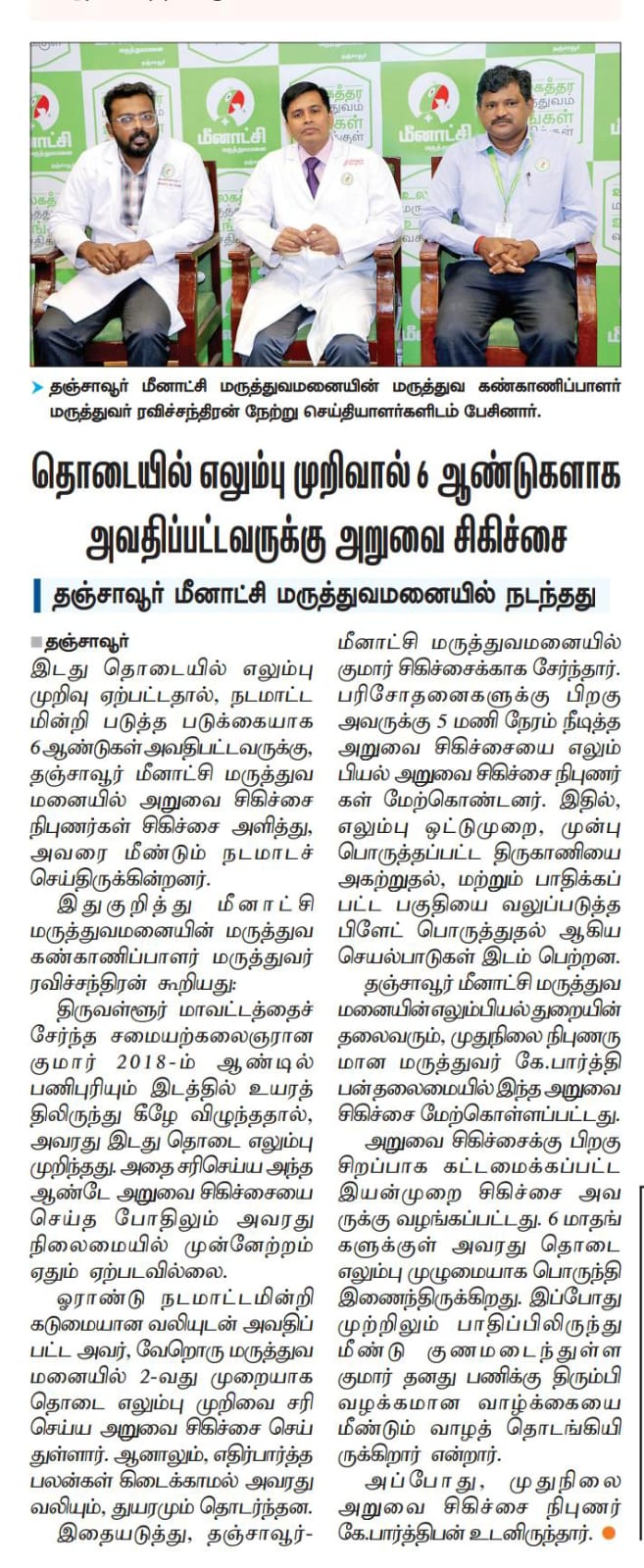 Recent Posts News & Events January 13, 2026Neck Spine Surgery at Meenakshi Hospital Thanjavur Restores Movement in Child with Rare Skeletal Disorderby meenakshi-tanjore News & Events November 29, 2025Meenakshi Hospital Thanjavur Introduces Cutting-Edge Technology to Detect Micro vascular Heart Disease Invisible on Angiogramsby meenakshi-tanjore News & Events June 16, 202527 Kg Mass Removed from 45-Year-Old Woman in Complex Surgery at Meenakshi Hospital Thanjavurby meenakshi-tanjore Meenakshi Hospital-Thanjavur, Enters Asia Book of Records for Conducting Maximum LDCT lung Cancer Screenings within One Hour 27 Kg Mass Removed from 45-Year-Old Woman in Complex Surgery at Meenakshi Hospital Thanjavur
