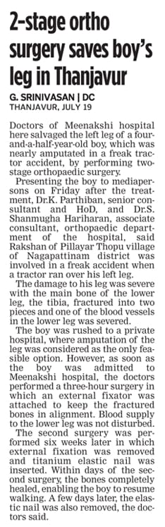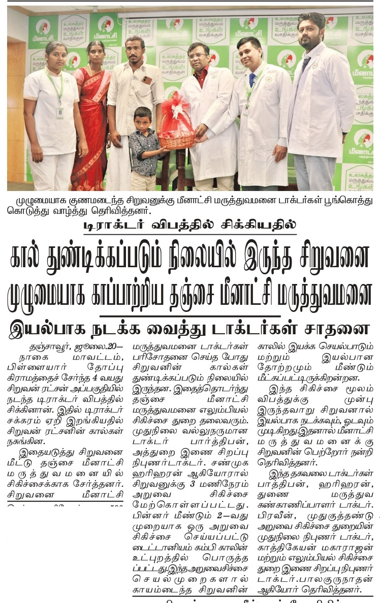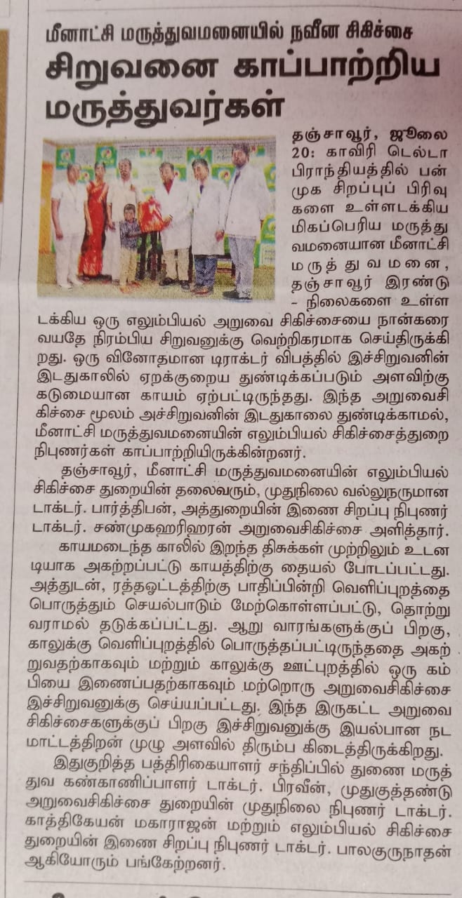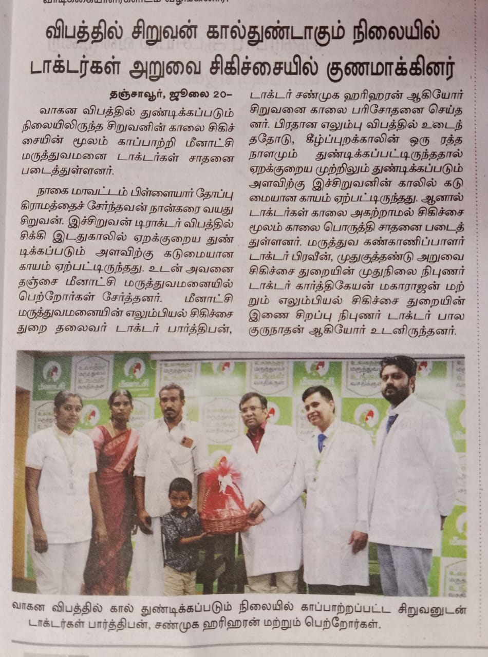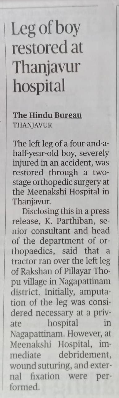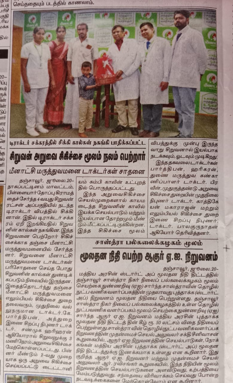Recent Posts News & Events January 13, 2026Neck Spine Surgery at Meenakshi Hospital Thanjavur Restores Movement in Child with Rare Skeletal Disorderby meenakshi-tanjore News & Events November 29, 2025Meenakshi Hospital Thanjavur Introduces Cutting-Edge Technology to Detect Micro vascular Heart Disease Invisible on Angiogramsby meenakshi-tanjore News & Events June 16, 202527 Kg Mass Removed from 45-Year-Old Woman in Complex Surgery at Meenakshi Hospital Thanjavurby meenakshi-tanjore Meenakshi Hospital Wins AHPICON 2024 Award for Best Hospital in Tanjore Transcatheter Aortic Valve Implantation at Meenakshi Hospital Thanjavur Avoids Need for Heart Valve Surgery in Senior Citizen