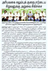 The complex surgery, Occipito Cervical Transfacetal screw fixation, was carried out by Dr. Arun Kumar and Dr. Kaveeze, neurosurgeons, with support from Dr. Arimanikam and Dr Vinodha Devi, neuro anesthetists. Post-surgery care was managed by the critical care specialists, Dr. Shobana Devi and Dr. Siva Kumar. Dr. Abdul Rahman, Pediatrician, also played an important role in the treatment and recovery of the child.