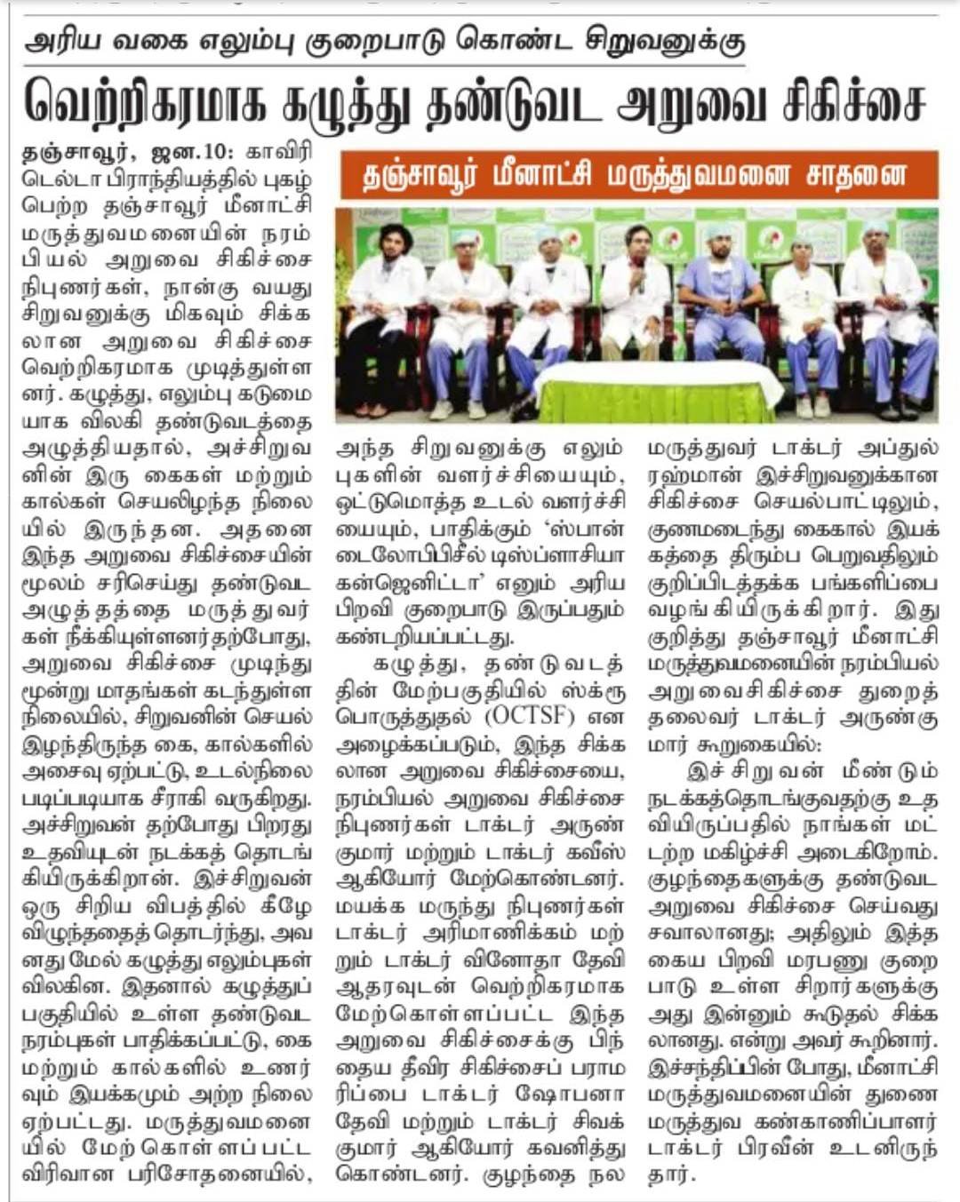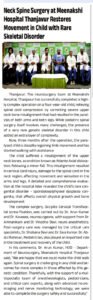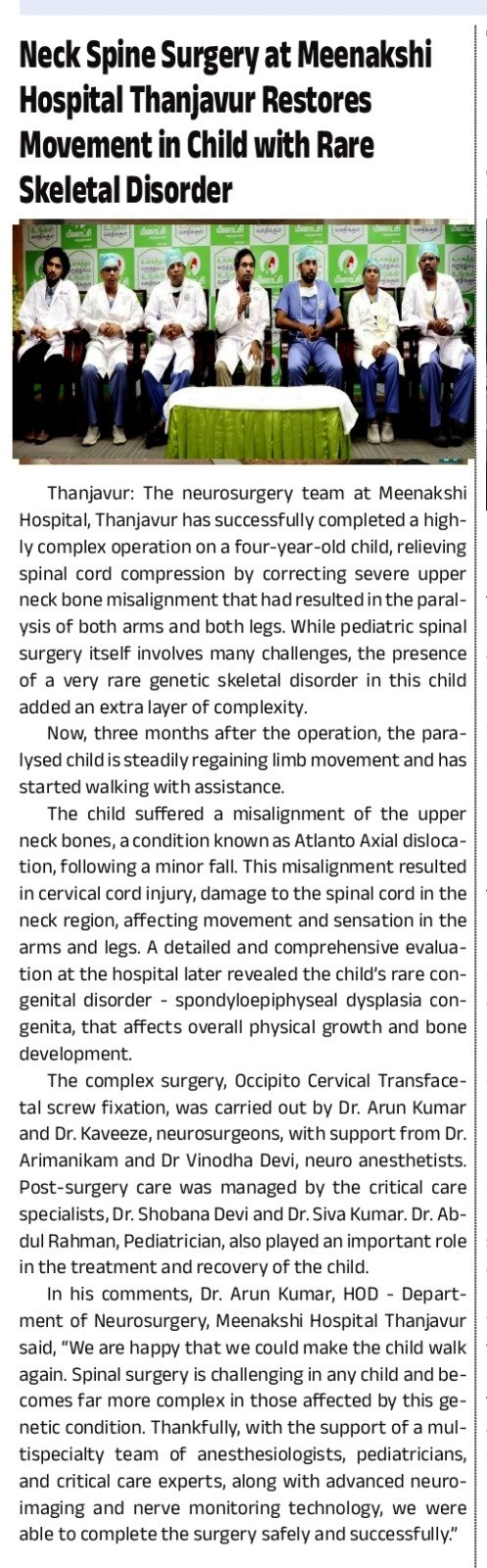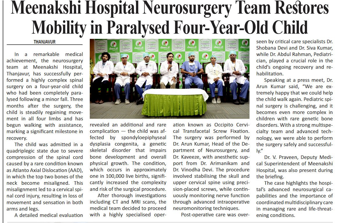 Thanjavur, January 9, 2026: The neurosurgery team at Meenakshi Hospital, Thanjavur has successfully completed a highly complex operation on a four-year-old child, relieving spinal cord compression by correcting severe upper neck bone misalignment that had resulted in the paralysis of both arms and both legs. While pediatric spinal surgery itself involves many challenges, the presence of a very rare genetic skeletal disorder in this child added an extra layer of complexity.
