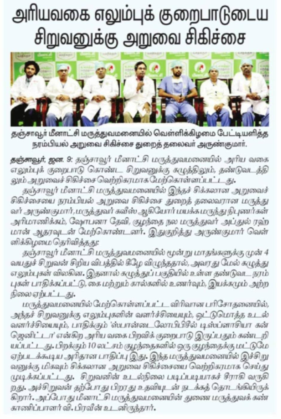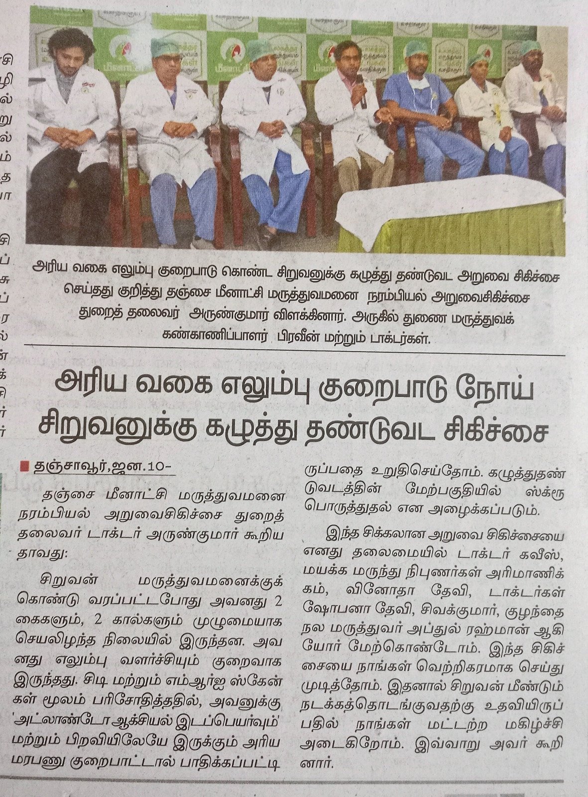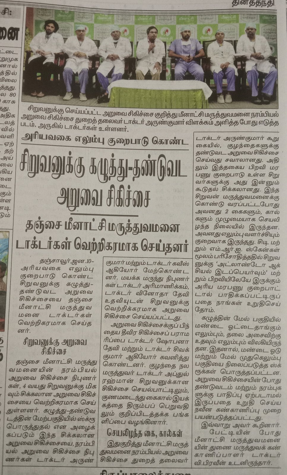 Thanjavur, January 9, 2026: The neurosurgery team at Meenakshi Hospital, Thanjavur has successfully completed a highly complex operation on a four-year-old child, relieving spinal cord compression by correcting severe upper neck bone misalignment that had resulted in the paralysis of both arms and both legs. While pediatric spinal surgery itself involves many challenges, the presence of a very rare genetic skeletal disorder in this child added an extra layer of complexity.