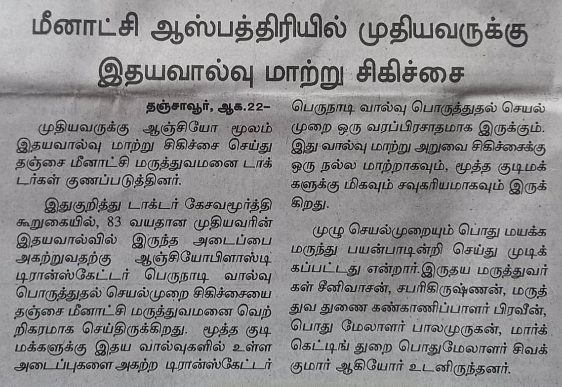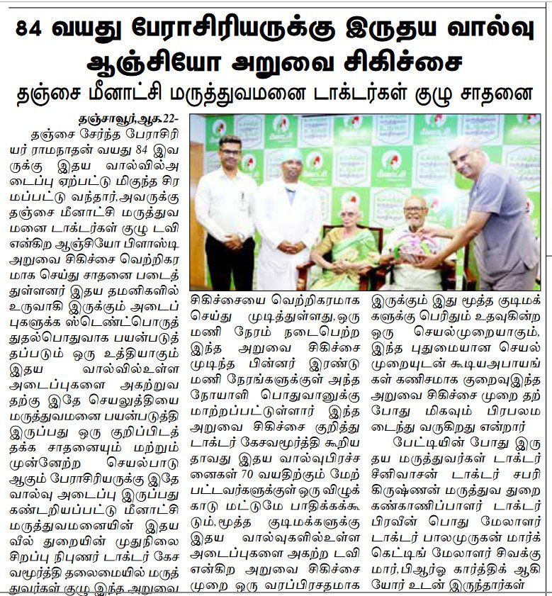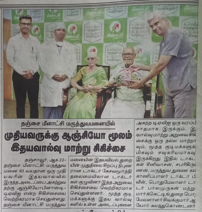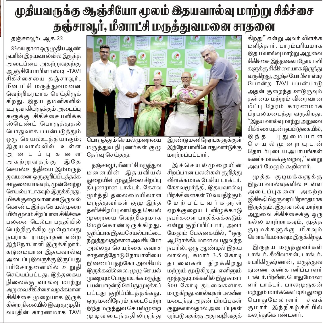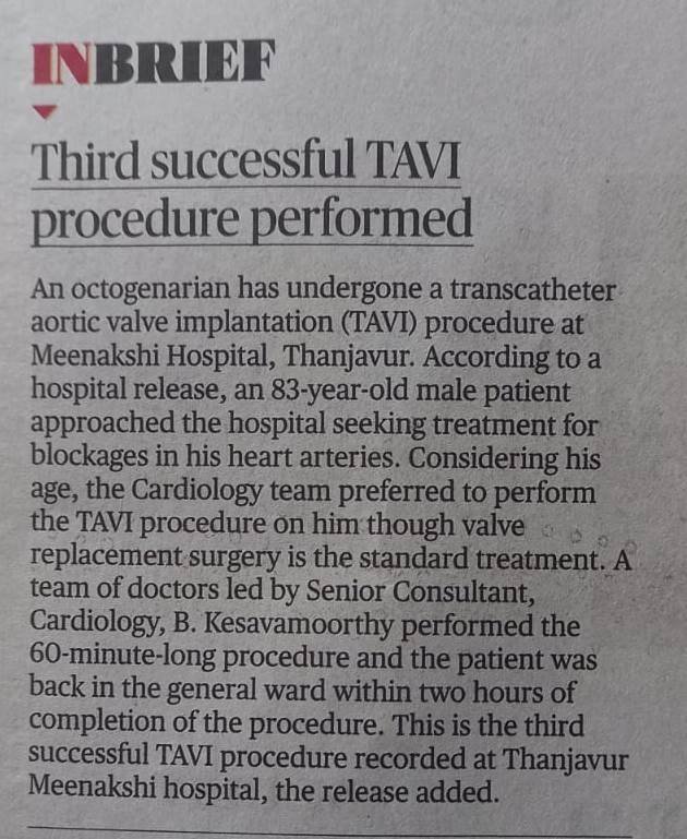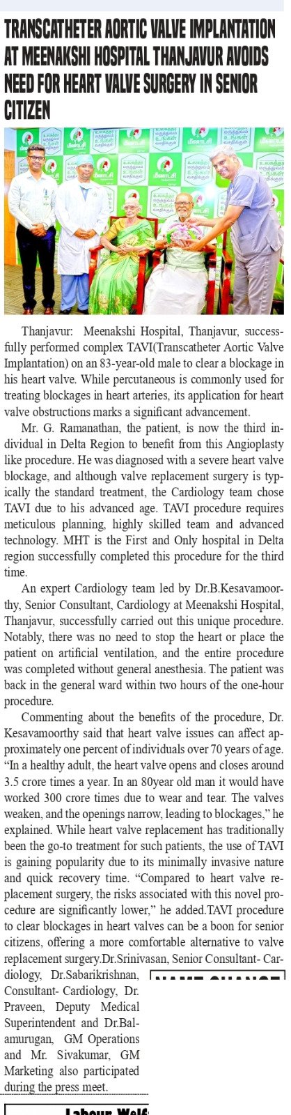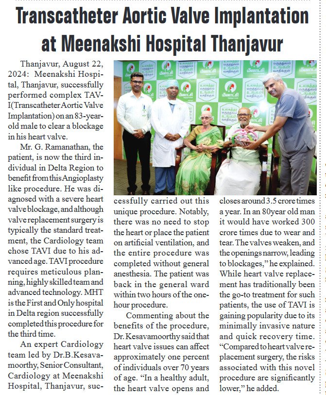 Thanjavur, August 21, 2024: Meenakshi Hospital, Thanjavur, successfully performed complex TAVI(Transcatheter Aortic Valve Implantation) on an 83-year-old male to clear a blockage in his heart valve. While percutaneous is commonly used for treating blockages in heart arteries, its application for heart valve obstructions marks a significant advancement.