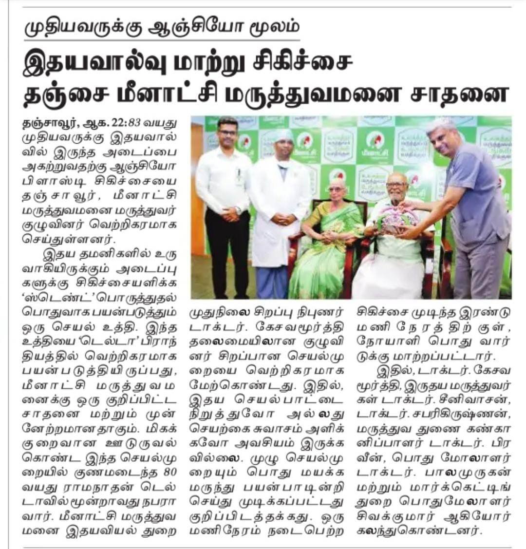 An expert Cardiology team led by Dr.B.Kesavamoorthy, Senior Consultant, Cardiology at Meenakshi Hospital, Thanjavur, successfully carried out this unique procedure. Notably, there was no need to stop the heart or place the patient on artificial ventilation, and the entire procedure was completed without general anesthesia. The patient was back in the general ward within two hours of the one-hour procedure.