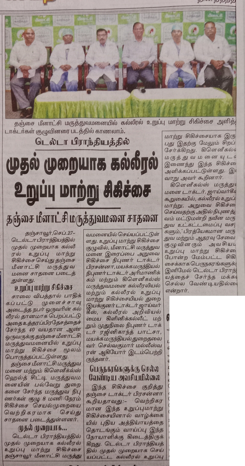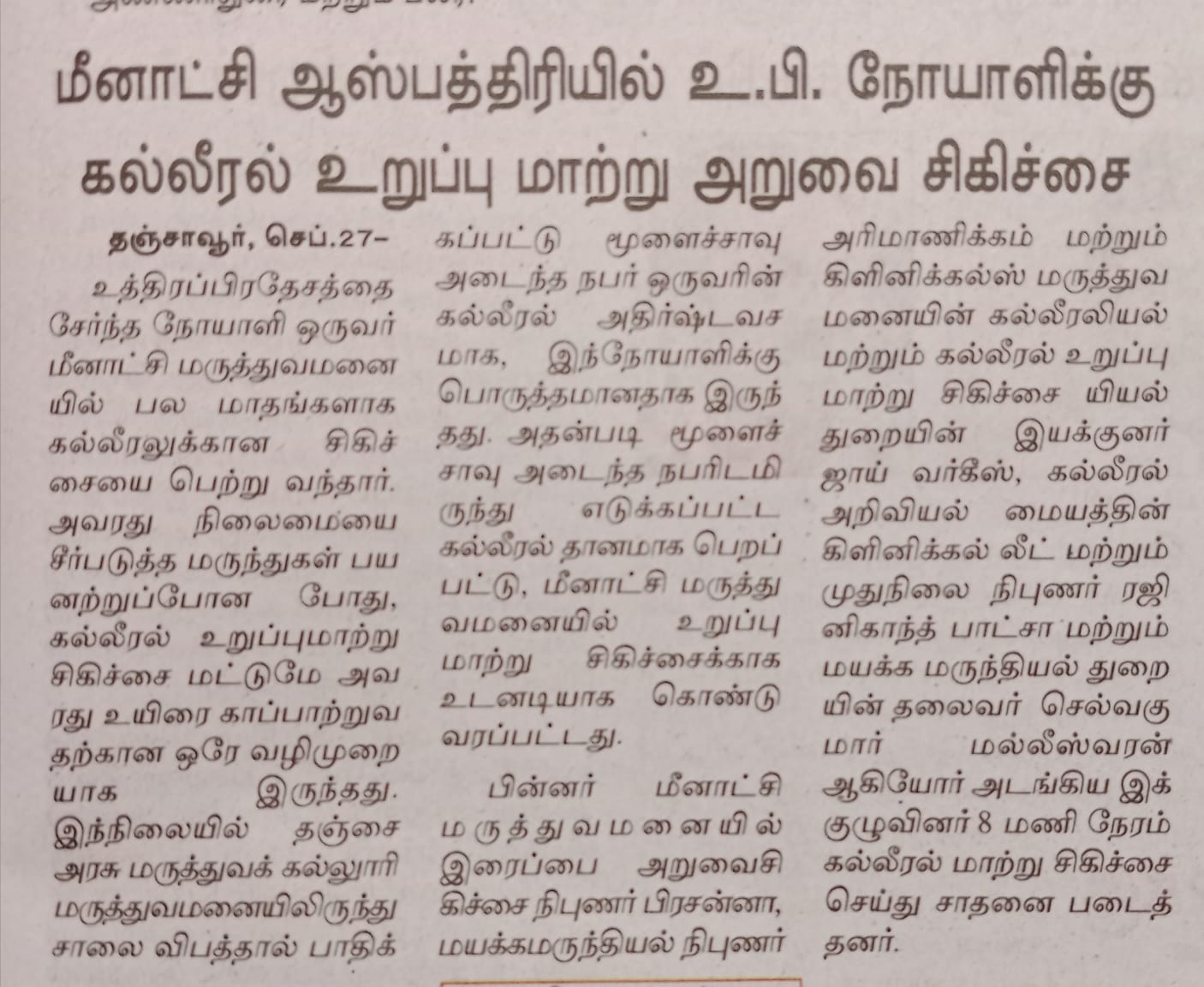 Meenakshi Hospital Thanjavur, a leading multi-specialty hospital has an ongoing partnership with Gleneagles Hospital, one of India’s renowned multi-organ transplant centers, located in Chennai, under which Gelneagles experts in liver procedures regularly visit Thanjavur and provide consultations and treatments to patients at Meenakshi Hospital.