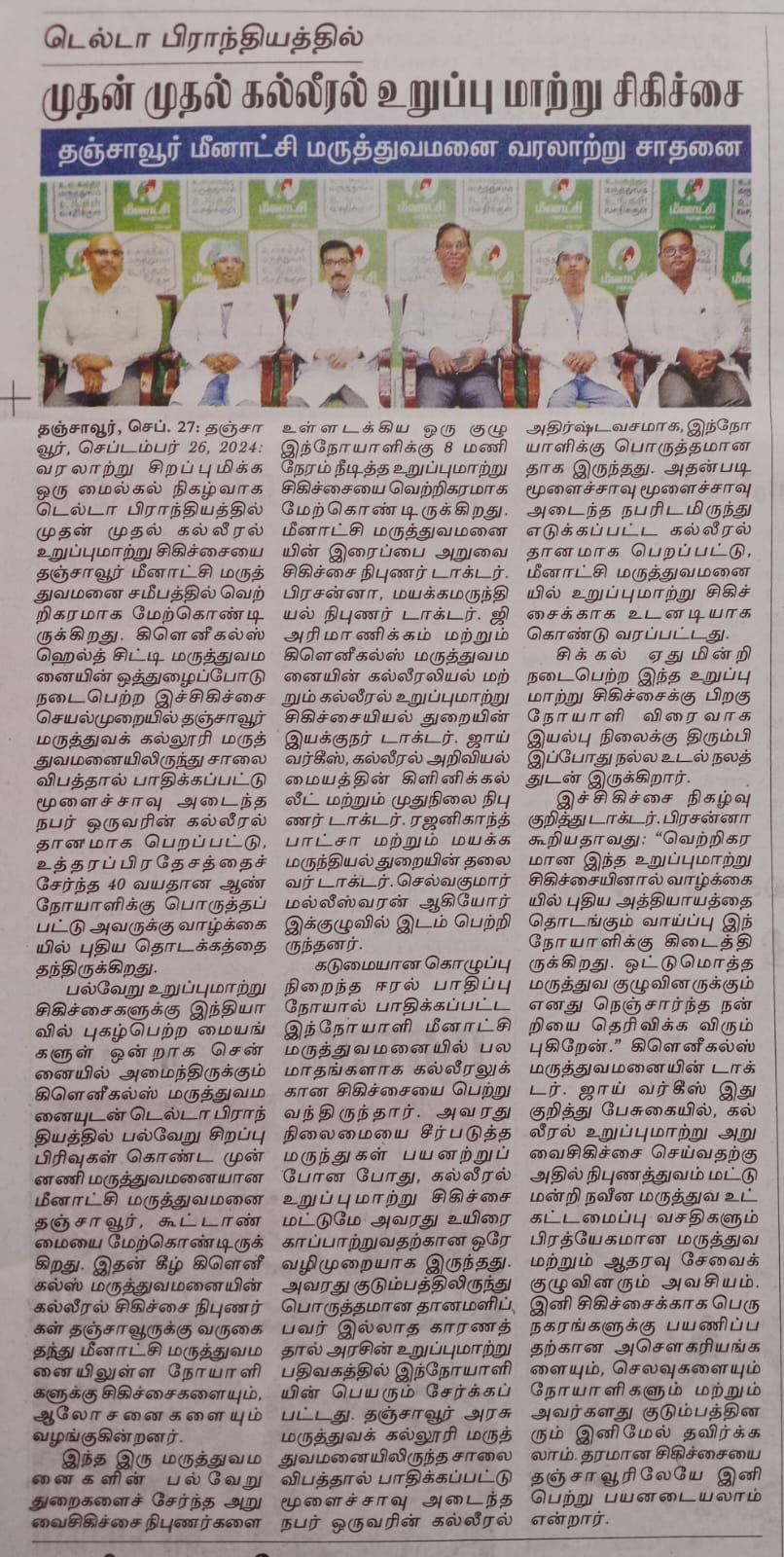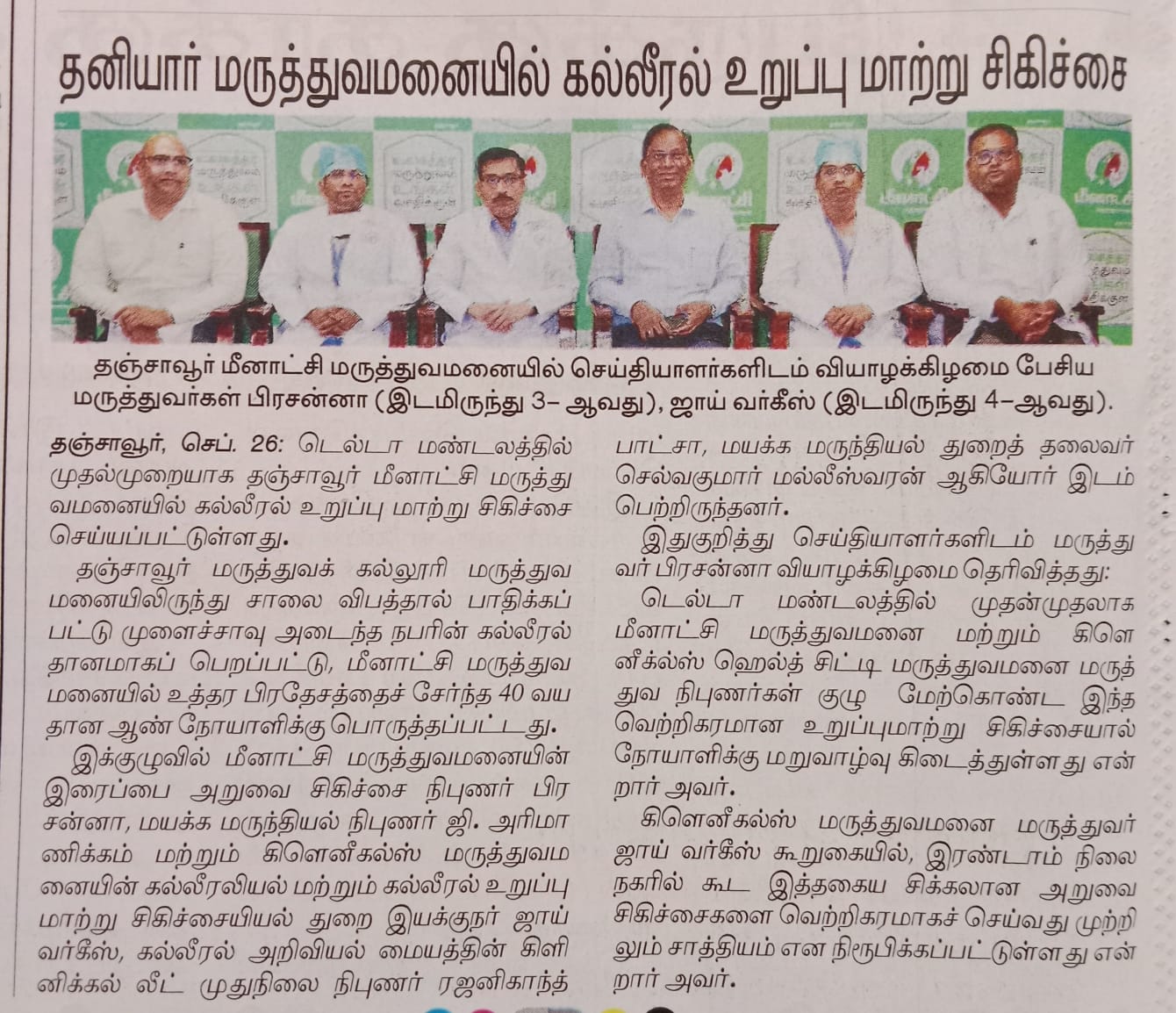 In his comments, Dr. Joy Varghese said that performing a liver transplant surgery demands not only expertise in transplantation but also a sophisticated and comprehensive medical infrastructure, along with a dedicated medical and support team. “We are proud to have such a facility and team at Meenakshi Hospital, Thanjavur. The people of the delta region no longer need to travel to larger cities for advanced procedures like transplantation. With this successful liver transplant, we have shown that it is entirely possible to perform such complex surgeries in a tier-II city without compromising on quality and safety. Patients and their families can avoid the inconveniences, discomfort, and expenses of traveling to a big city for treatment.”